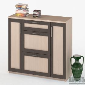 Комод может быть изготовлен в различных цветовых вариантах. Небольшой верхний ящик комода подойдет для хранения мелких предметов, дв а глубоких нижних ящика и два боковых отделения с закрытыми дверцами и полкой внутри позволят вместить большое количество одежды.