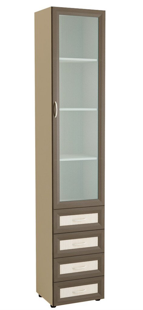 Удобный шкаф с дверцей из матового стекла и четырьмя удобными выдвижными ящиками. Подойдёт как для дома, так и для офиса. Приятно удивит вас своей многофункциональностью.