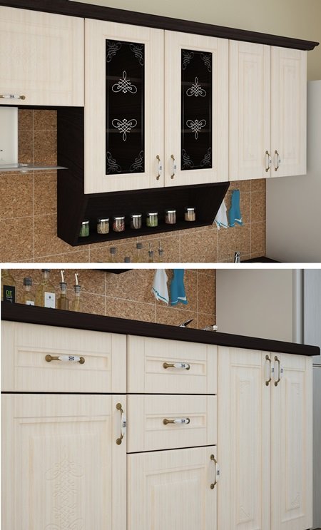 укомплектован всем необходимым: столешницей 38мм, глубокой врезной мойкой, эмалированной сушкой с поддоном, полочкой для специй, цоколем в цвет корпуса, карнизом в цвет корпуса, металлическими ручками и ножками