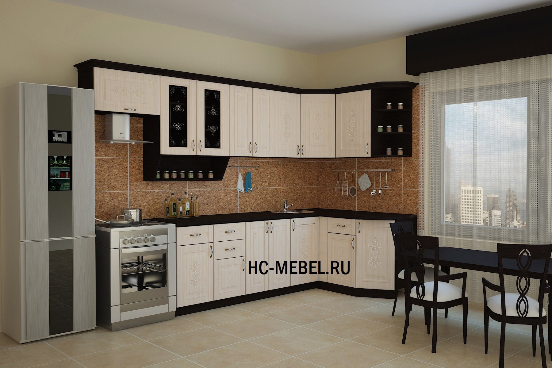 Размеры: 3000х1465мм. Материал: Корпус-ЛДСП, цвет венге. Фасад-МДФ, цвет млечный дуб. Столешница 38мм, цвет венге. Ручка дуга металл. Цоколь в цвет корпуса. Стекло витраж |