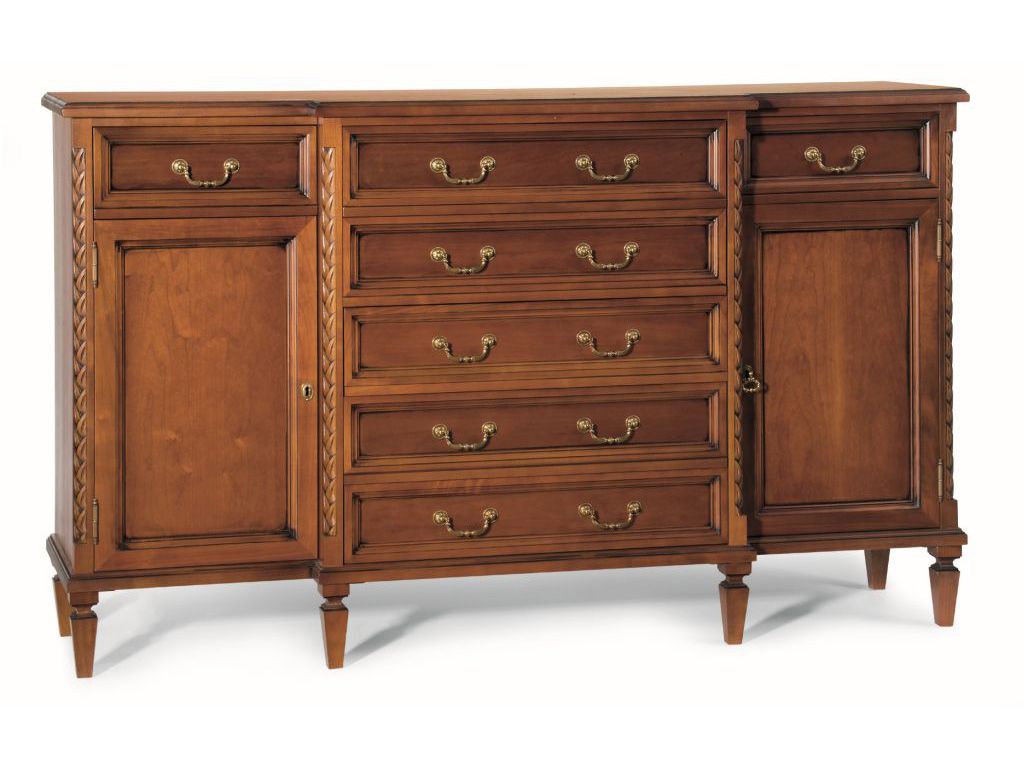Комод станет идеальным решением для спальной. В нишах и выдвижных ящиках можно поместить нижнее и постельное белье. Корпус комода установлен на шести ножках, декорированных резьбой. Изделие обязательно порадует приверженцев классического стиля.